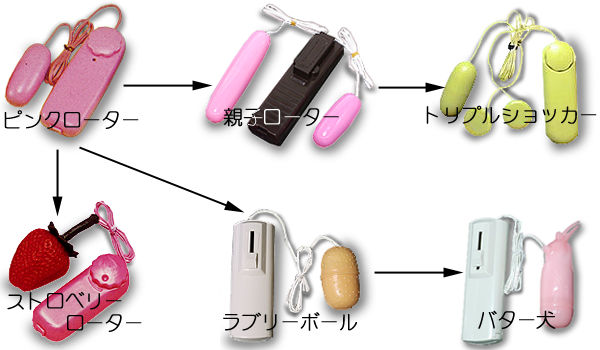| 画像の商品は今現在広く一般に販売されているローター達である。 それを見ておわかりのとおり電動ローターは多用に進化した。その姿を見ればローターは膣の中に入れて刺激を与えるために開発されたものではなく、クリトリスを刺激するために作られたものとわかると思う。(もちろん挿入してもいいし、中には挿入を前提に開発された物もある。) 基本的にはリモコン部+モーター部の構成は変わらず、ローターの数が増える物、形を変えた物、表面をソフトラバー等でコーティングした物と多くの形に進化している。 その進化は快楽を追求する玩具として当然の事であろう。 それでは進化を少し説明してみることにしよう。