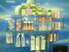 次は・・、あれれ?なんだか見たことある商品がズラ〜リ!あっ!これはKIYOでもお馴染みの、ペペローションを作っているメーカーさんのブースだっ!空をイメージした夏らしいブースの棚に置かれた商品。